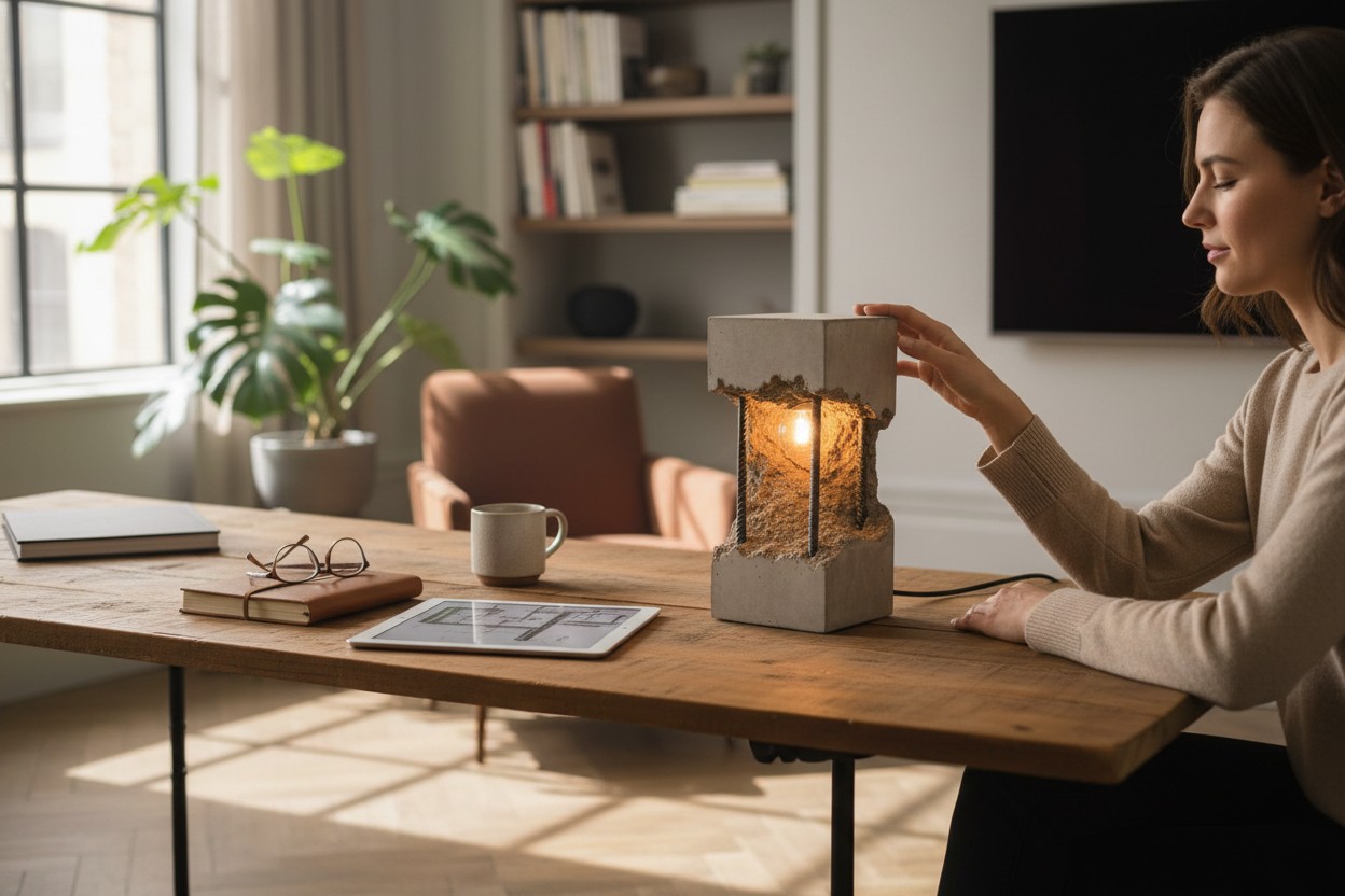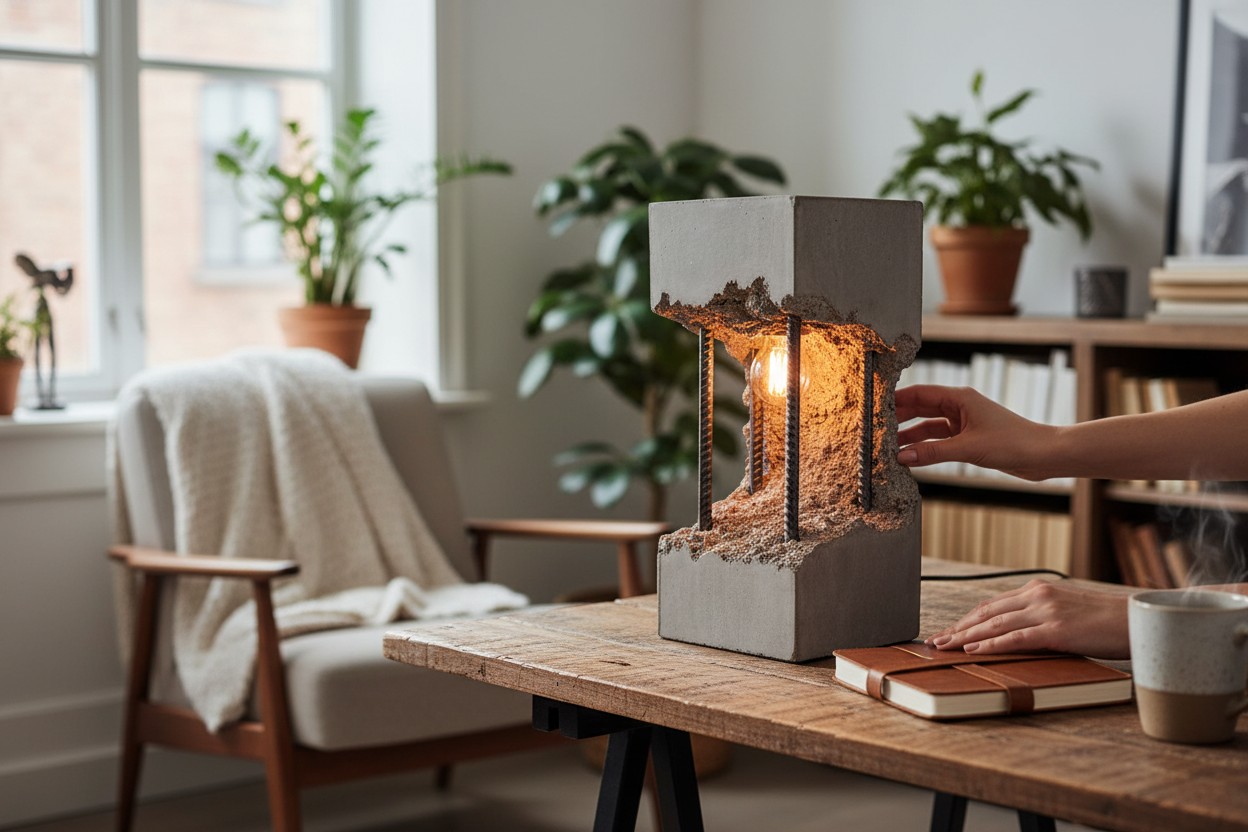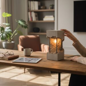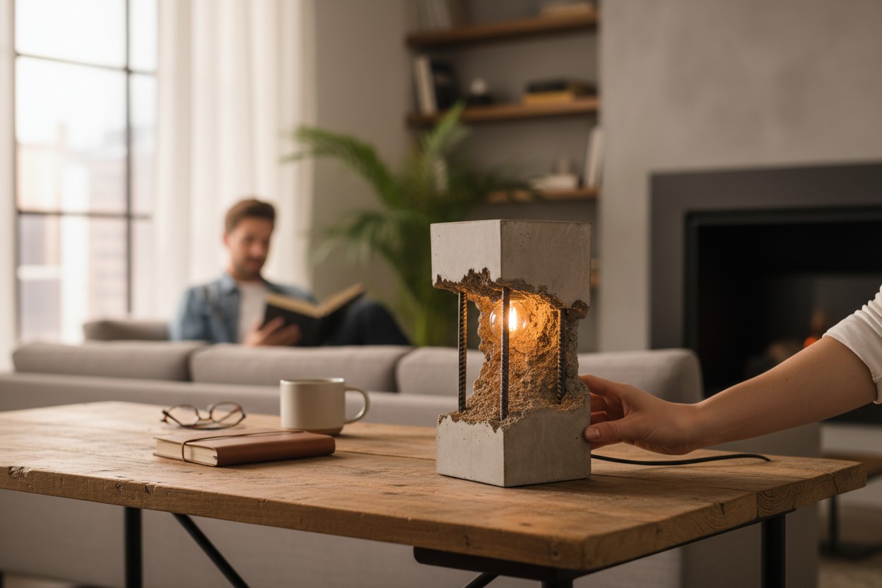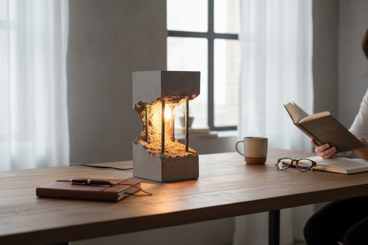 Surowość betonu łączy się tu z ciepłym światłem żarówki, tworząc dekorację, która ociepla wnętrze i nadaje mu wyjątkowego klimatu. Idealna do: salonu, sypialni, biurka, półki, stolika nocnego, przestrzeni loftowych i minimalistycznych.