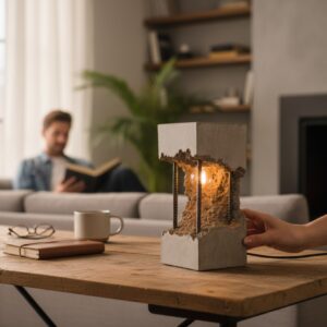 Betonowa Przestrzeń to lampa stworzona dla osób, które kochają minimalizm, industrialny klimat i wyjątkowe, niepowtarzalne dodatki. Każdy egzemplarz jest odlewany ręcznie z betonu, dzięki czemu ma indywidualną strukturę, naturalne mikropęknięcia i delikatne cieniowania — to właśnie one tworzą jej artystyczny charakter.