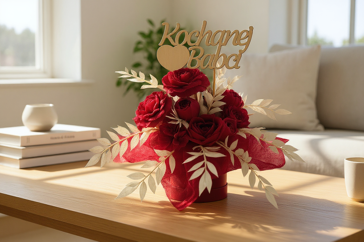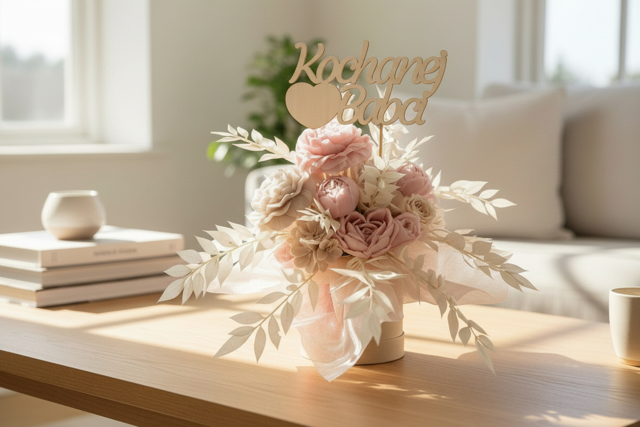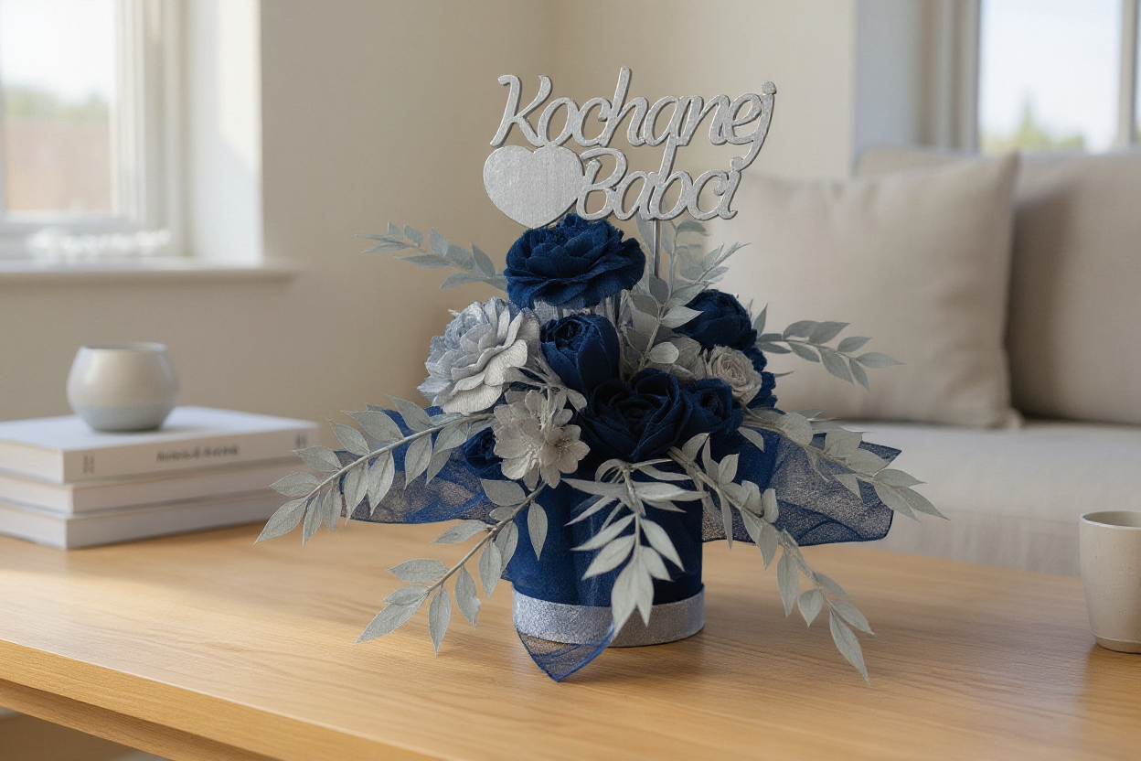 Ręcznie wykonane kwiaty świecowe ułożone w harmonijną, naturalną kompozycję tworzą prezent pełen emocji — idealny na Dzień Babci.