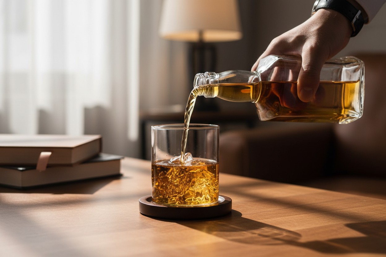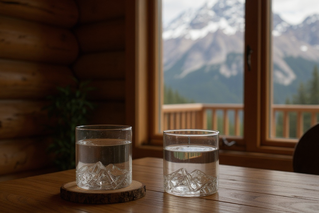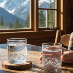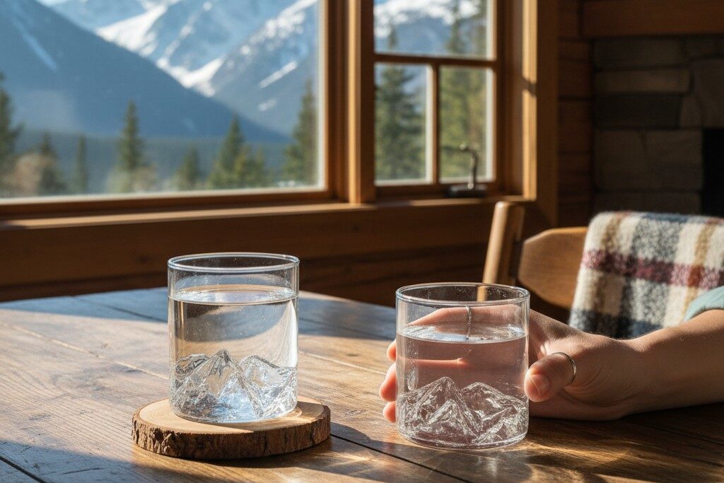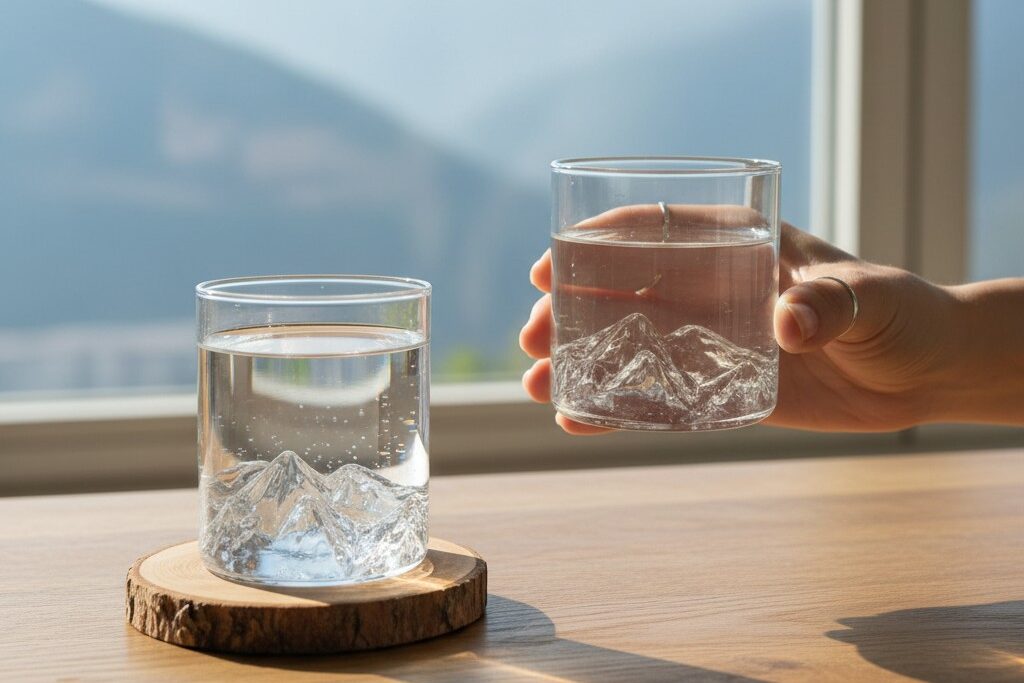 Każda szklanka ma ręcznie formowane, trójwymiarowe dno w kształcie majestatycznego szczytu. Kiedy nalejesz napój, relief staje się jeszcze bardziej wyraźny — jak góry oświetlone zachodzącym słońcem.