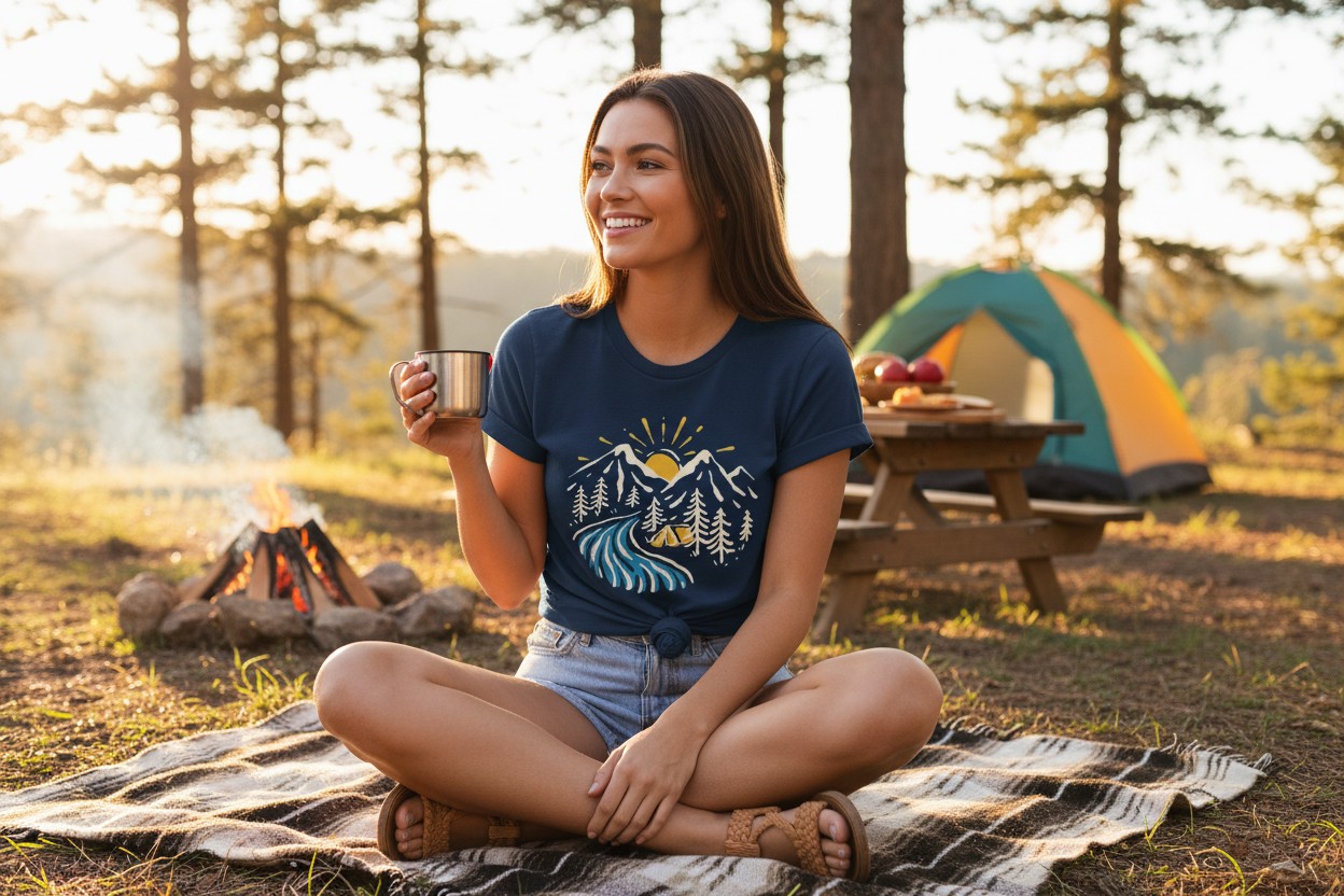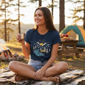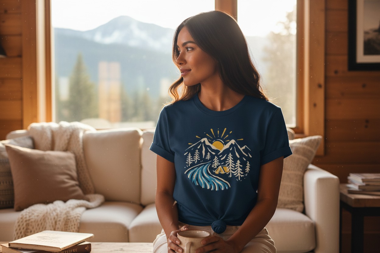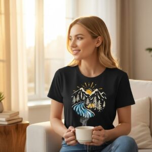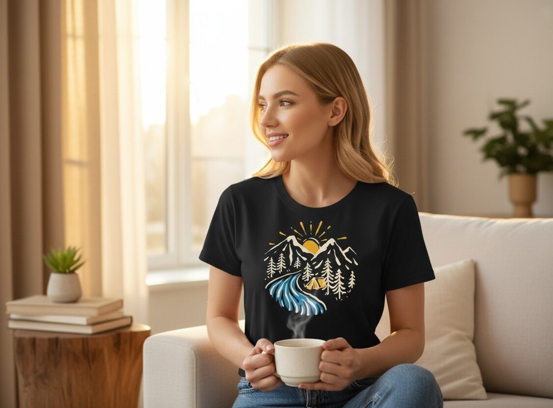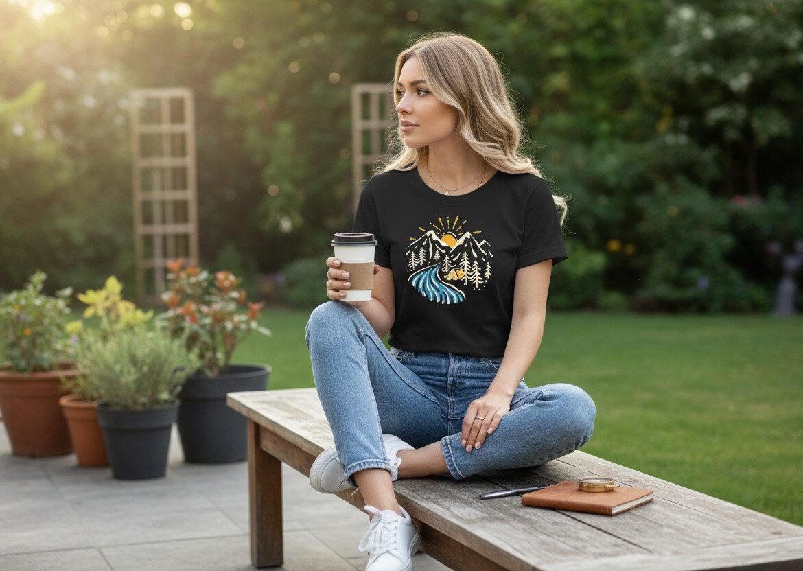 Ta koszulka łączy minimalistyczną grafikę gór z rozżarzonym słońcem — jak krótki moment ciszy tuż przed zmrokiem. Miękka, oddychająca bawełna i naturalna kolorystyka sprawiają, że to idealny wybór dla miłośniczek wędrówek, natury i prostych form.