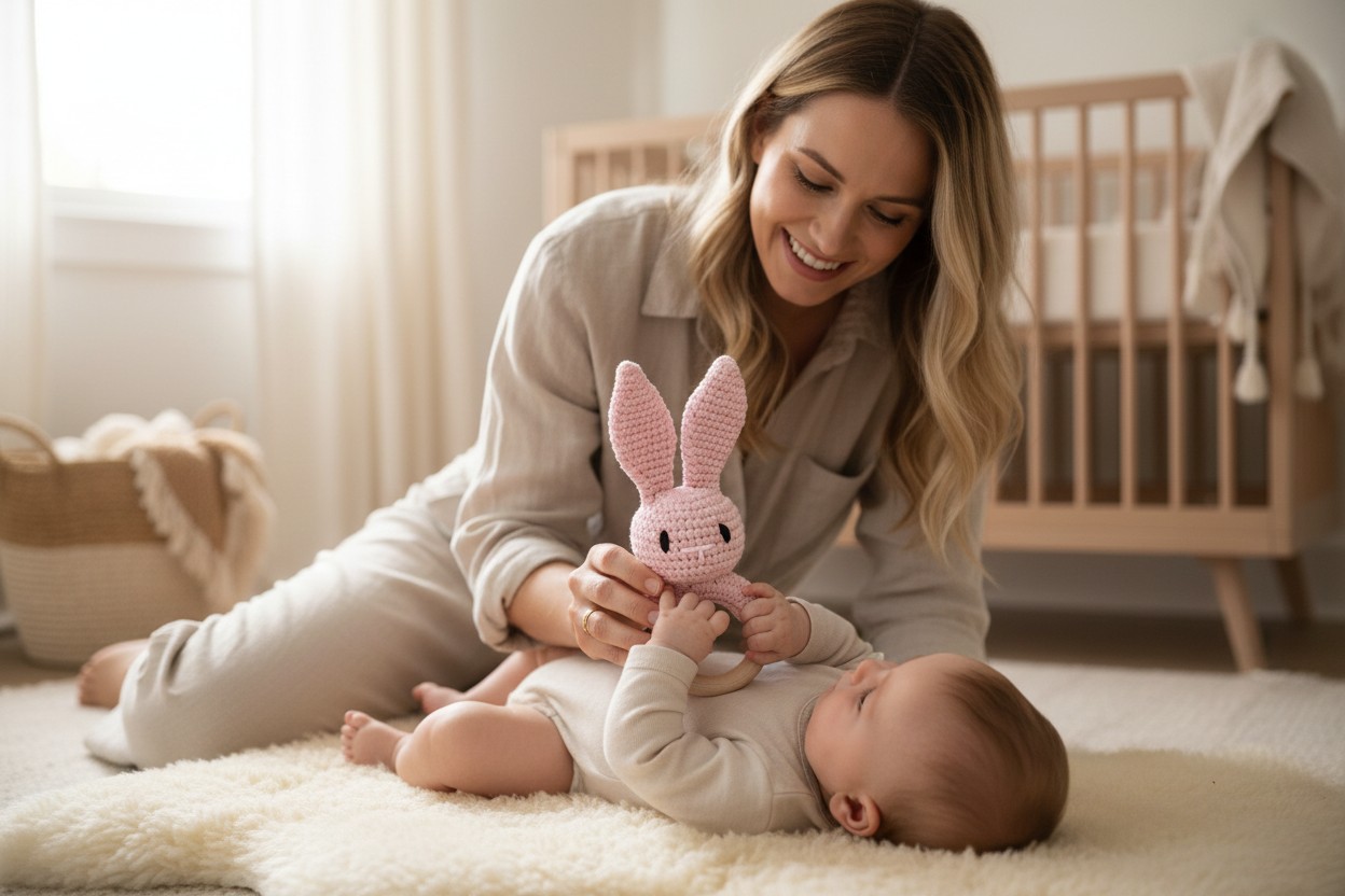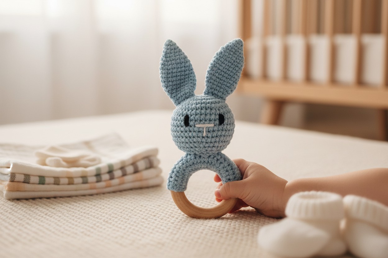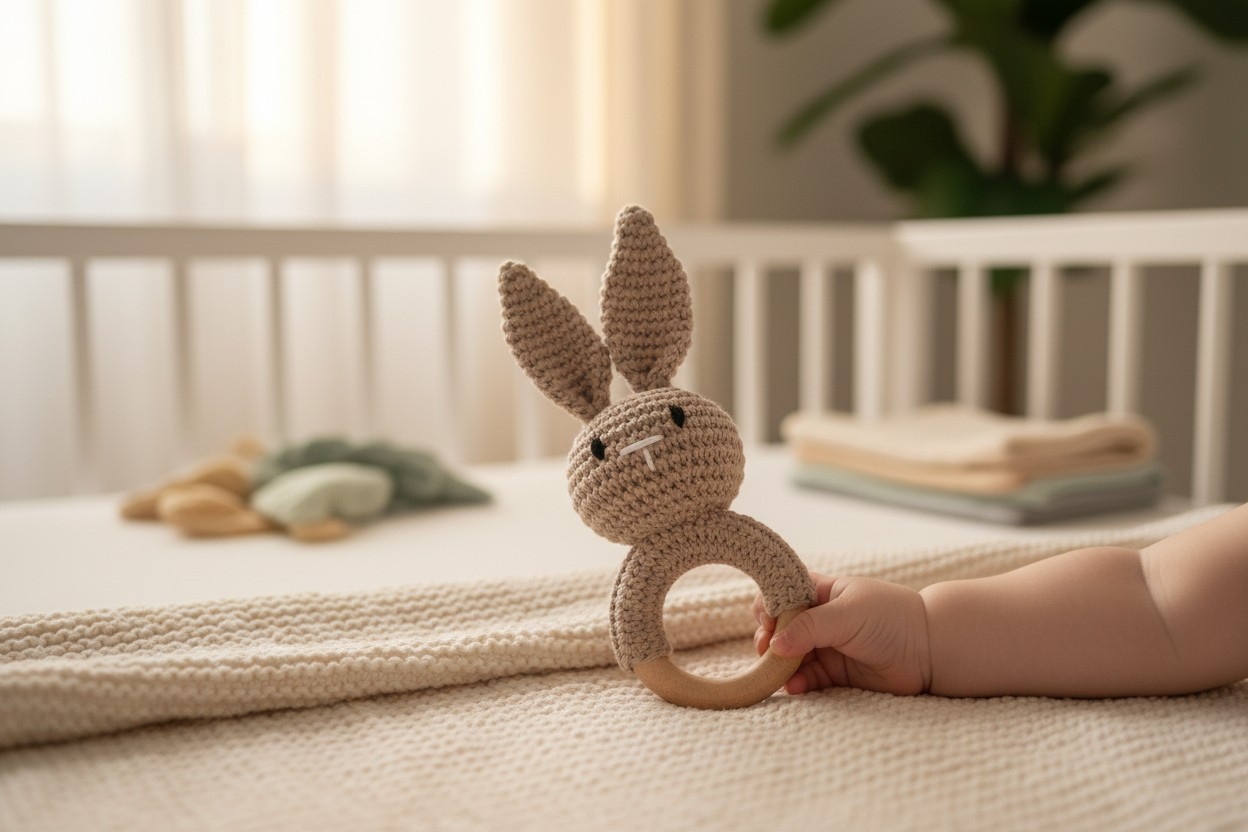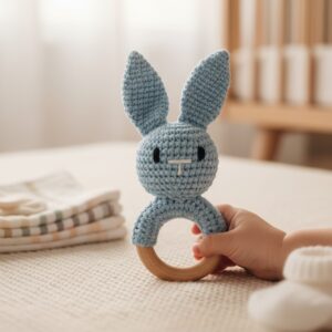 Leśny Zajączek łączy w sobie te trzy elementy — mięciutka maskotka z subtelną grzechotką oraz bezpieczny, drewniany gryzak tworzą zestaw, który koi, zaciekawia i wspiera rozwój sensoryczny.