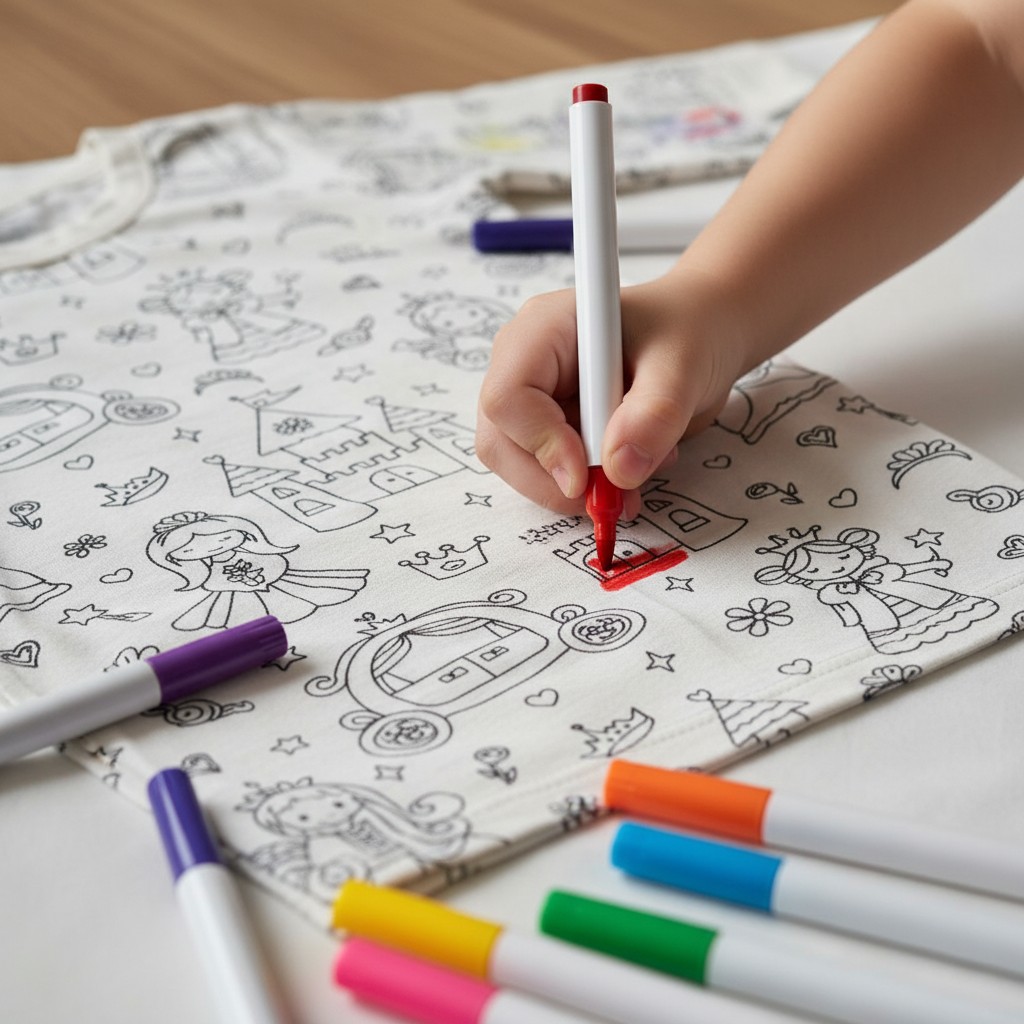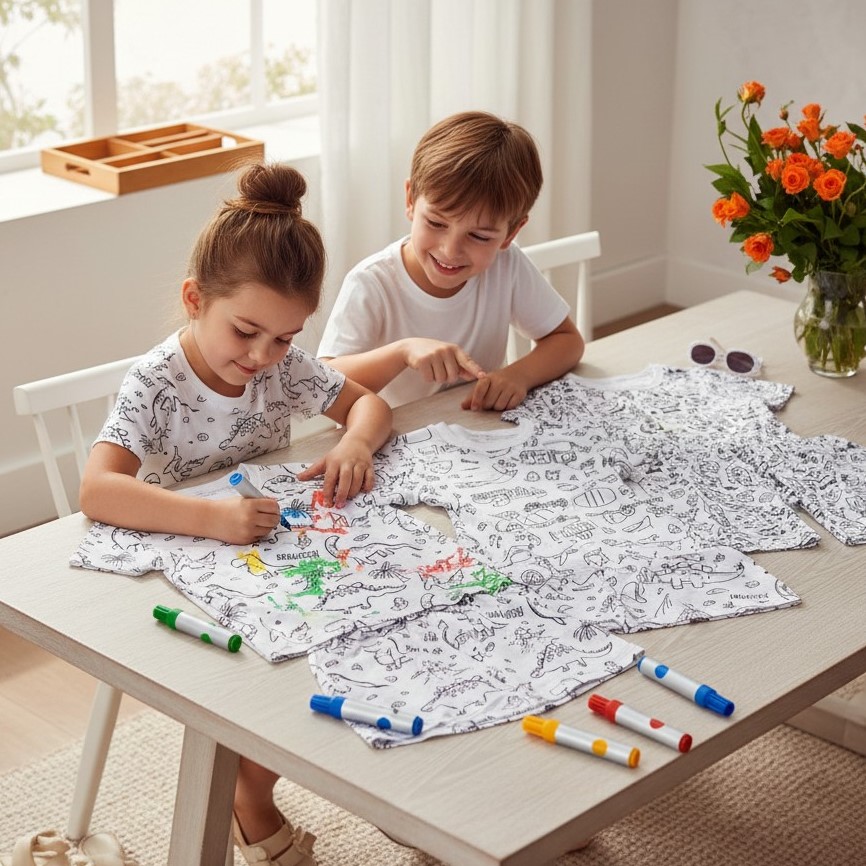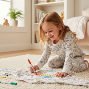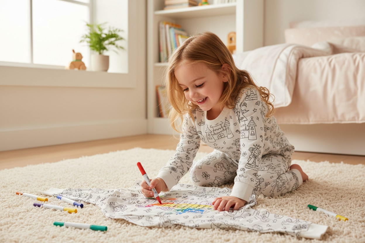 Piżama-Malowanka powstała po to, by tę magię uwolnić — łączy miękki, wygodny materiał z radością kolorowania. Każde dziecko może stworzyć własny wzór, własną historię, własne barwy.