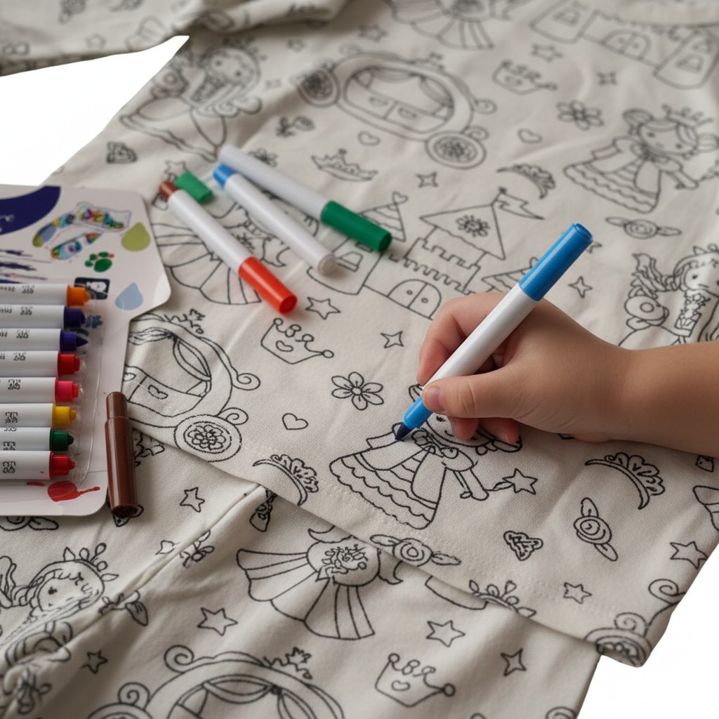 Zestaw zawiera piżamkę oraz zestaw mazaków przeznaczonych do tkanin.