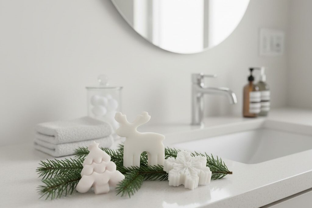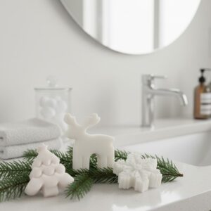 Śnieżne odbicia to kolekcja ręcznie tworzonych świątecznych mydełek w kształtach zimowych symboli — renifera, choinki, pierniczka i śnieżynki.