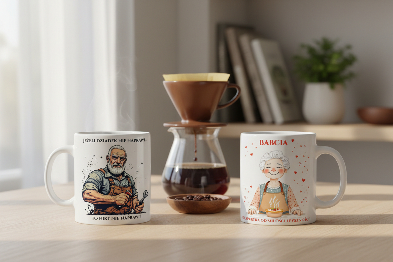 Podaruj Babci i Dziadkowi coś, co każdego dnia przypomni im o Waszej miłości. Zestaw Ciepło Pokoleń to dwa eleganckie kubki ceramiczne, każdy z sentymentalnym motywem i napisem: