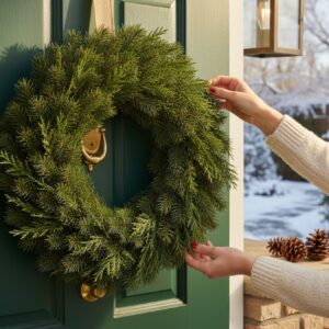 Zimowy Szept Lasu to wianek wykonany z prawdziwego, świeżego igliwia — układanego ręcznie, gałązka po gałązce, tak aby stworzyć naturalną, harmonijną kompozycję. Ma około 40 cm średnicy, dzięki czemu jest wystarczająco duży, aby przyciągać wzrok na drzwiach, ale jednocześnie lekki i subtelny, by pięknie prezentować się również wewnątrz domu: nad kominkiem, w salonie, na ścianie czy w holu. To ciche zaproszenie do świątecznego, ciepłego domu. Dekoracja, która wprowadza magię jeszcze zanim otworzysz drzwi.